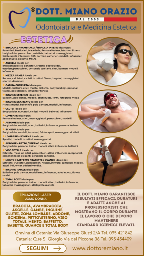 Sbiancamento e pulizia dei denti. Applicazione di faccette. Interventi di estetica dentale, come applicazione di brillantini sugli incisivi. Interventi su rughe e cicatrici del viso tramite filler.